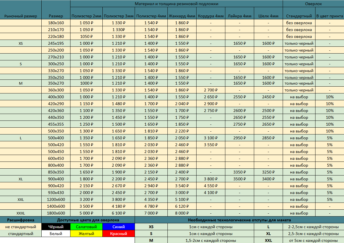"В таблице вы можете увидеть расчёт по цене согласно выбранному размеру и другим опциям таким как: материал поверхности, толщина подложки, цвет прошивки прошивки краёв коврика"